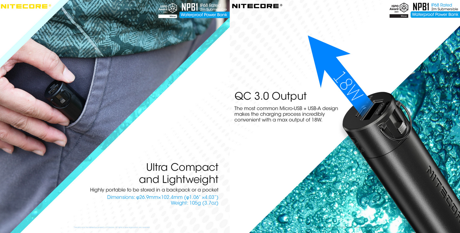 Nitecore NPB1 ( power bank 5000 mAh) est une batterie externe, de la taille d'une batterie 21700. Sa compostion lui permet de peser seulement 105g, ce qui lui permet d'être emmenée partout sans contrainte. Elle est étanche selon la norme IP68, ce qui vous permet de faire charger vos appareils même lorsque vous courrez sous la pluie.