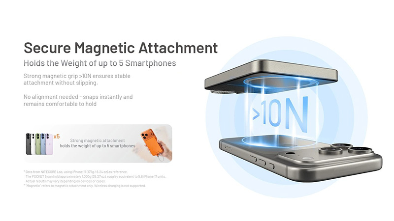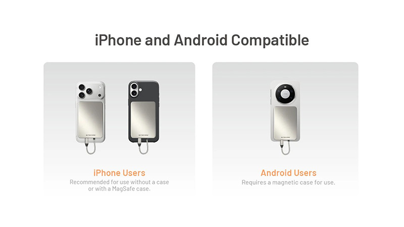 Le système de fixation magnétique permet d'accrocher facilement la batterie externe au dos du téléphone pendant la charge. Sa faible épaisseur permet aisément d'utiliser votre téléphone même lorsque la batterie est fixée à l'arrière.