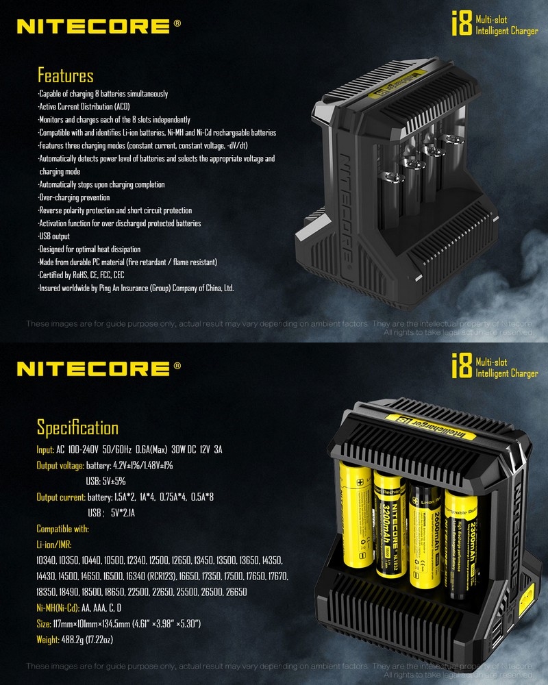 Le chargeur NItecore i8 fait partie la gamme des chargeurs i1, i2, et i4, il permet de charger simultanément 8 batteries avec un courant de 500mA. Vous pouvez recharger en même temps des batteries Li-ion ou Ni-MH car chaque slot est indépendant.