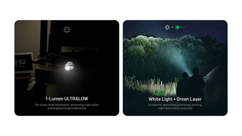Lorsque la lumière blanche est allumée, maintenez le bouton M enfoncé pour allumer simultanément la lumière blanche et le laser vert. Relâchez le bouton pour éteindre le laser vert.