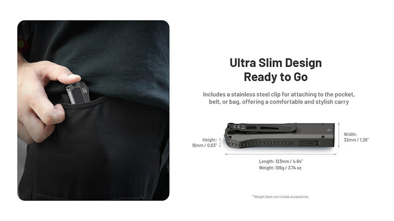 Conçue pour le port quotidien, l'EDC17 est fabriquée en acier inoxydable durable et bénéficie d'une protection IPX7 contre l'immersion temporaire ainsi qu'une résistance aux chocs jusqu'à 2 mètres. Son design plat ultra-compact de 123mm de longueur assure un transport discret en poche ou sur ceinture.