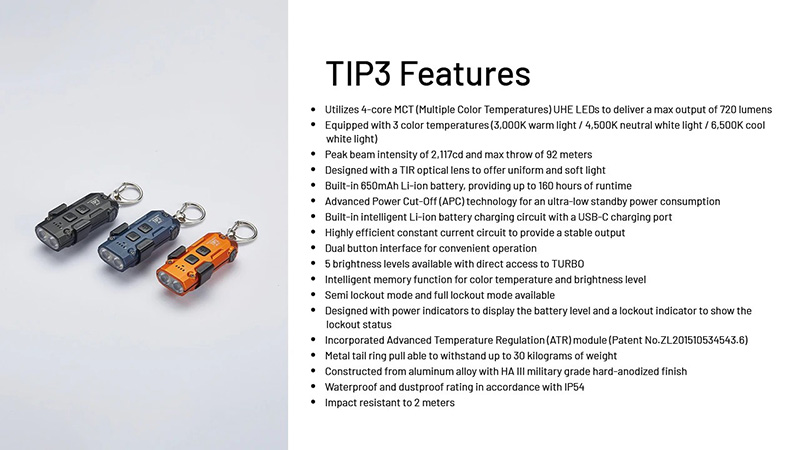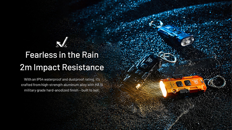 Conçue pour l'EDC quotidien, la TIP3 est fabriquée en construction robuste et bénéficie d'une protection IP54 contre les éclaboussures et la poussière ainsi qu'une résistance aux chutes de 2 mètres. Son clip amovible et son attache porte-clés permettent de multiples options de port.