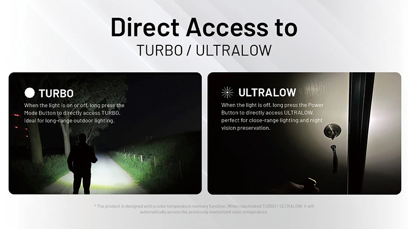 La lampe propose 5 modes d'éclairage adaptés à toutes les situations : mode Turbo pour l'éclairage maximal, mode High pour la puissance soutenue, mode Mid pour l'usage général, mode Low pour économiser la batterie, et mode Ultralow pour un éclairage discret longue durée. Sa fonction de mémorisation intelligente retient la dernière température de couleur et le dernier niveau de luminosité utilisés, tandis que les 4 indicateurs LED verts affichent le niveau de batterie en temps réel.