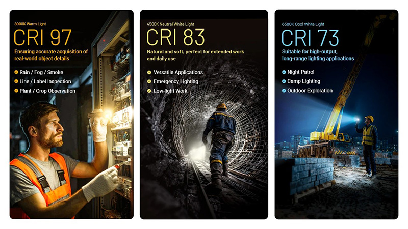 - Températures de couleur : 3 options (3000K IRC 97, 4500K IRC 83, 6500K IRC 73)