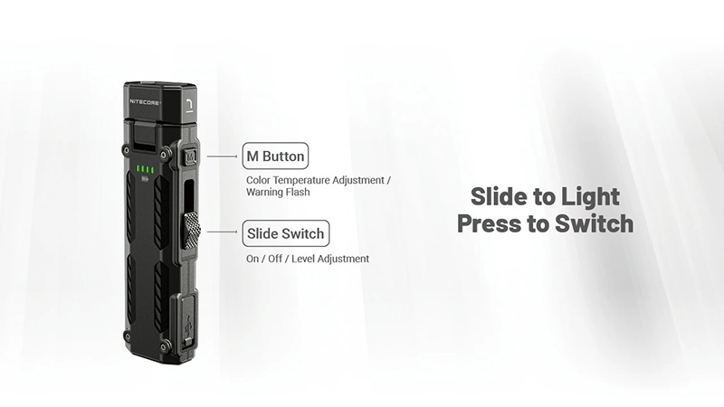 Lorsque la lampe est éteinte, maintenez le bouton M (M button) enfoncé tout en faisant glisser l'interrupteur (Slide switch) vers la tête pour activer ULTRALOW.