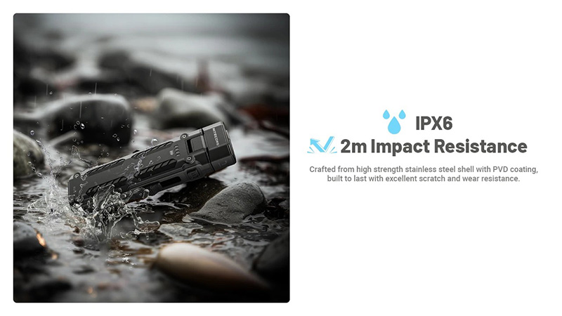 Conçue pour les environnements exigeants, la EDC09 est fabriquée en acier inoxydable haute résistance avec revêtement PVD et bénéficie d'une protection IPX6 contre les projections d'eau ainsi qu'une résistance aux chocs jusqu'à 2 mètres de chute. Son clip bidirectionnel en acier inoxydable assure un portage facile en poche ou sur l'équipement.