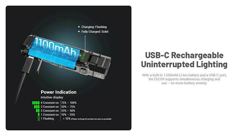 Rechargeable via port USB-C avec circuit de charge intelligent Li-ion, la EDC09 est l'outil d'éclairage idéal pour les techniciens, agents de maintenance, professionnels de l'industrie, forces de l'ordre et amateurs d'outdoor exigeant un équipement polyvalent, compact et performant.
