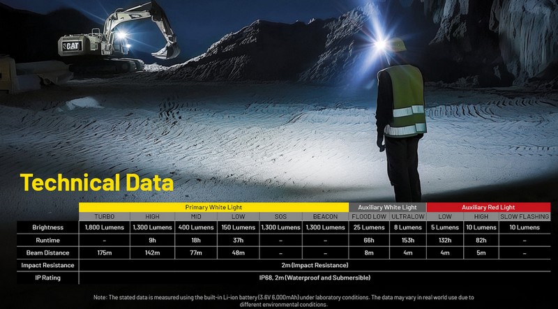 Lampe frontale rechargeable 1800 Lumens – 1 batterie Li-ion de 6000mAh intégrée – Autonomie max 153 heures à 8 Lumens – Étanche IP68 – Portée 175 mètres